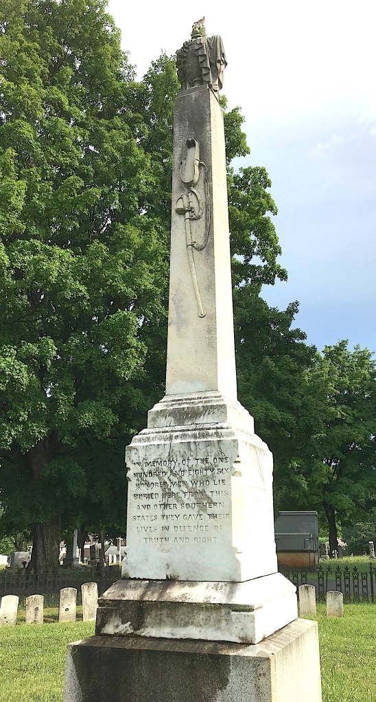 After the war in 1868, the Ladies Warren (County) Memorial Association was tasked with locating the graves of the Confederate dead in the county and relocating them all for burial at Prospect Hill. A total of 276 bodies were brought there. About 90 were buried in graves marked with veterans’ headstones, surrounding about 186 unidentified soldiers that were placed in the center of the circular lot.