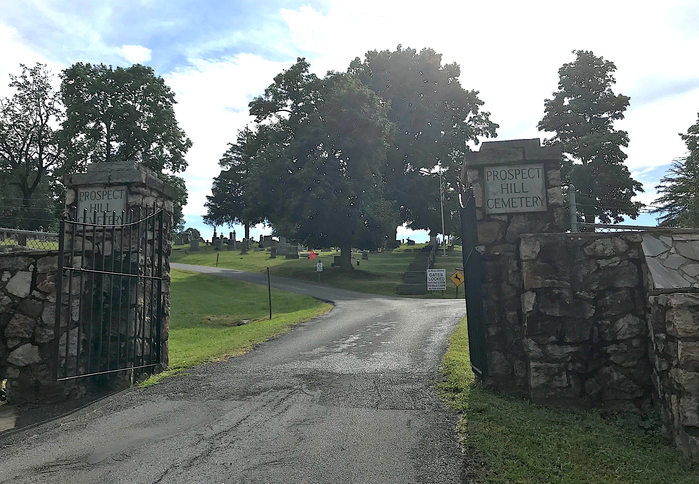 Covering about 31 acres, Prospect Hill Cemetery’s oldest marked grave is from 1802. Find a Grave.com lists about 11,400 burials (not all are marked).