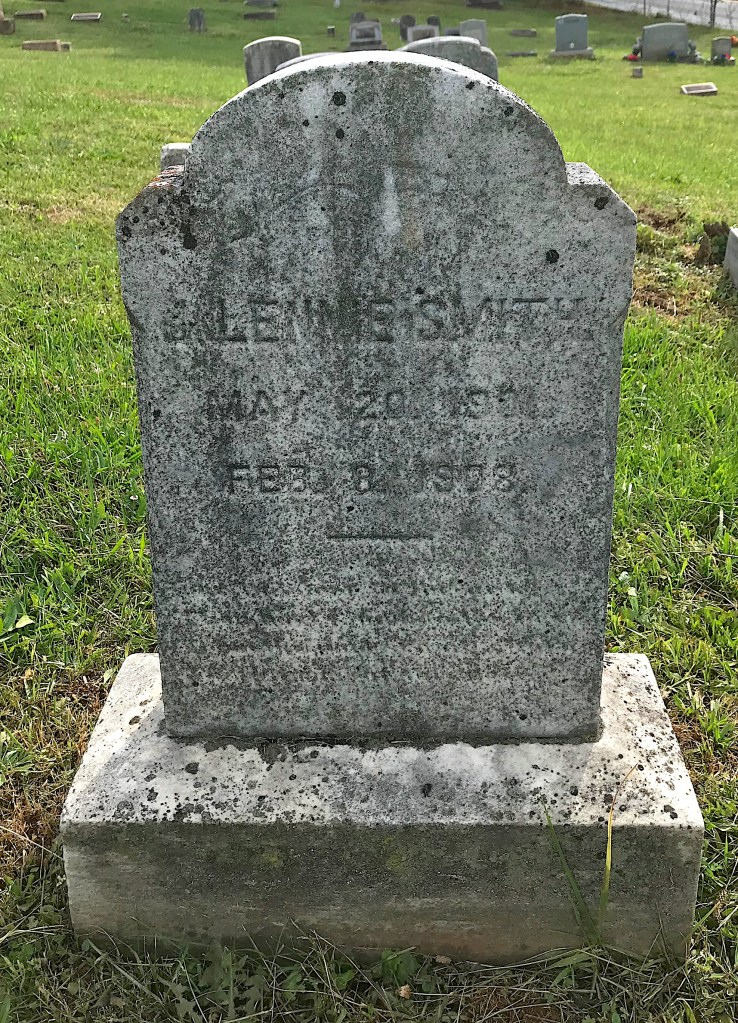 I photographed another Smith grave nearby that is not connected to this family on Find a Grave but I am fairly sure it is the first child of Dora and James. J. Lennie Smith was born on May 20, 1901 and died on Feb. 8, 1908. Because the child was born between census years, there is no other record I could find. However, the 1910 U.S. Census shows that Dora and James reported that she had given birth to three children but only two were living. I don’t know what caused little Lennie to die.