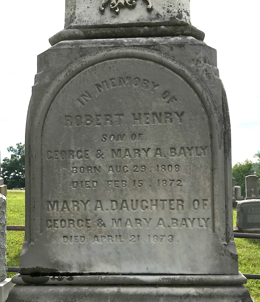 One of the largest monuments in the cemetery is for the Bayly family. A native of Virginia, George Bayly (1781-1860) was the son of Pierce Bayly of Loudon County, Va.. A Revolutionary War veteran and slave owner, Pierce established Diamond Hill Farm there in the 1770s with his wife, Mary. George and his wife, Elizabeth, had 11 children together, including a son named Robert Henry, born in 1808.