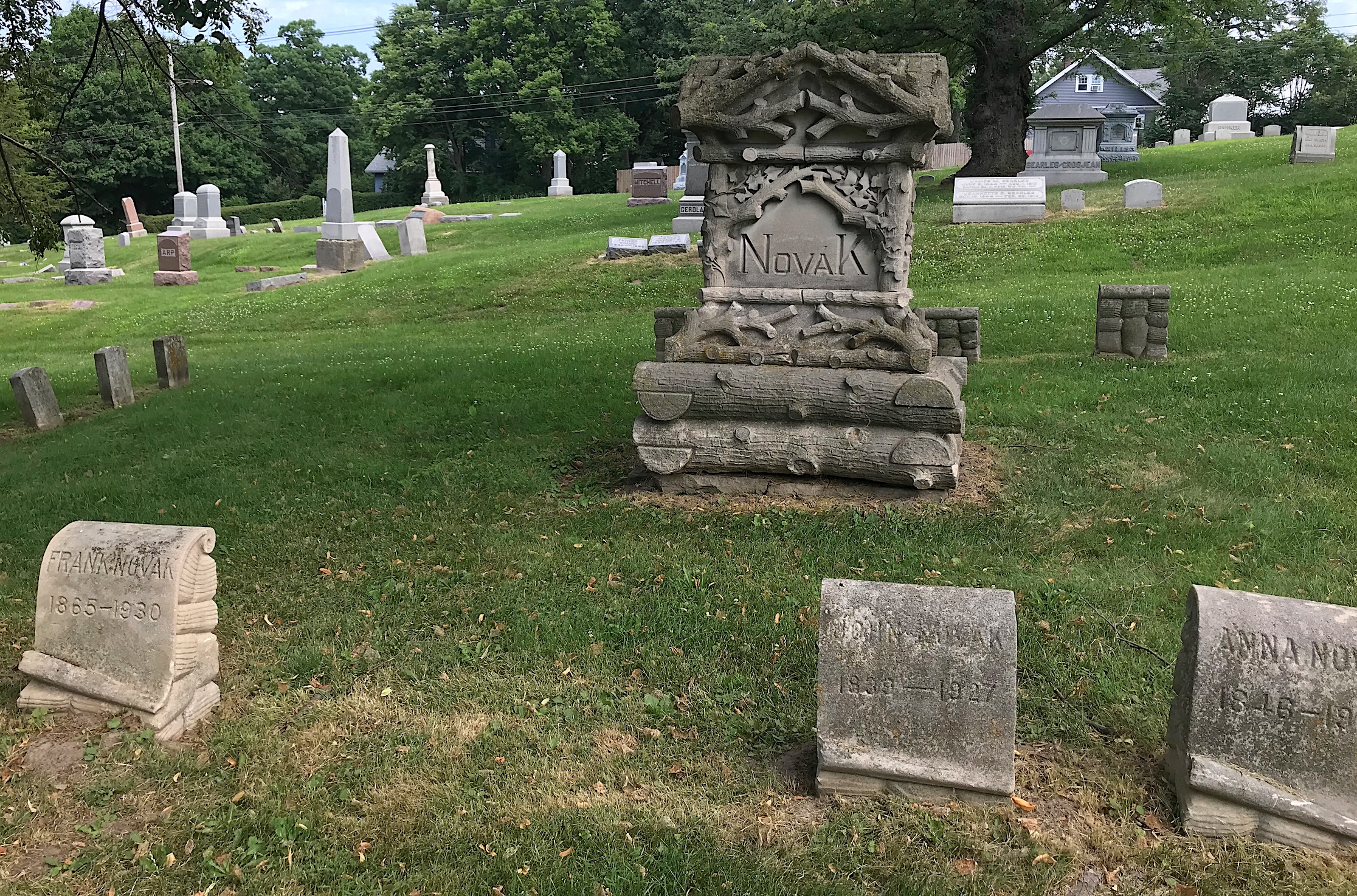 At OHC, white bronze monuments come in all shapes and sizes. But the largest one I could find was for the Bever family. There is one large monument for to represent all the Bevers, with individual markers for family members made of stone and white bronze. Find a Grave shows there are 23 Bever memorials listed at OHC.