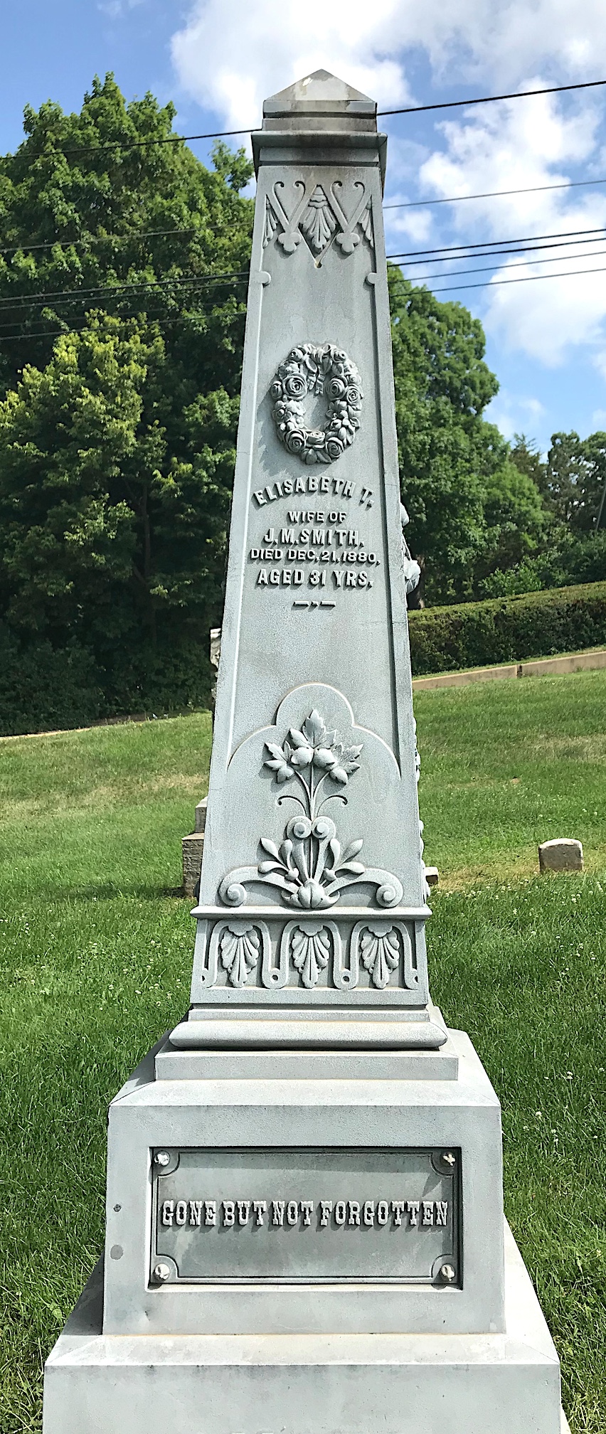 Nancy was left with their son, John, to fend for herself. A note published in the local newspaper a few days later expressed her thanks. This was a common practice back then. It sounds like John’s employer may have assisted her and John financially. They may have even provided his white bronze marker.