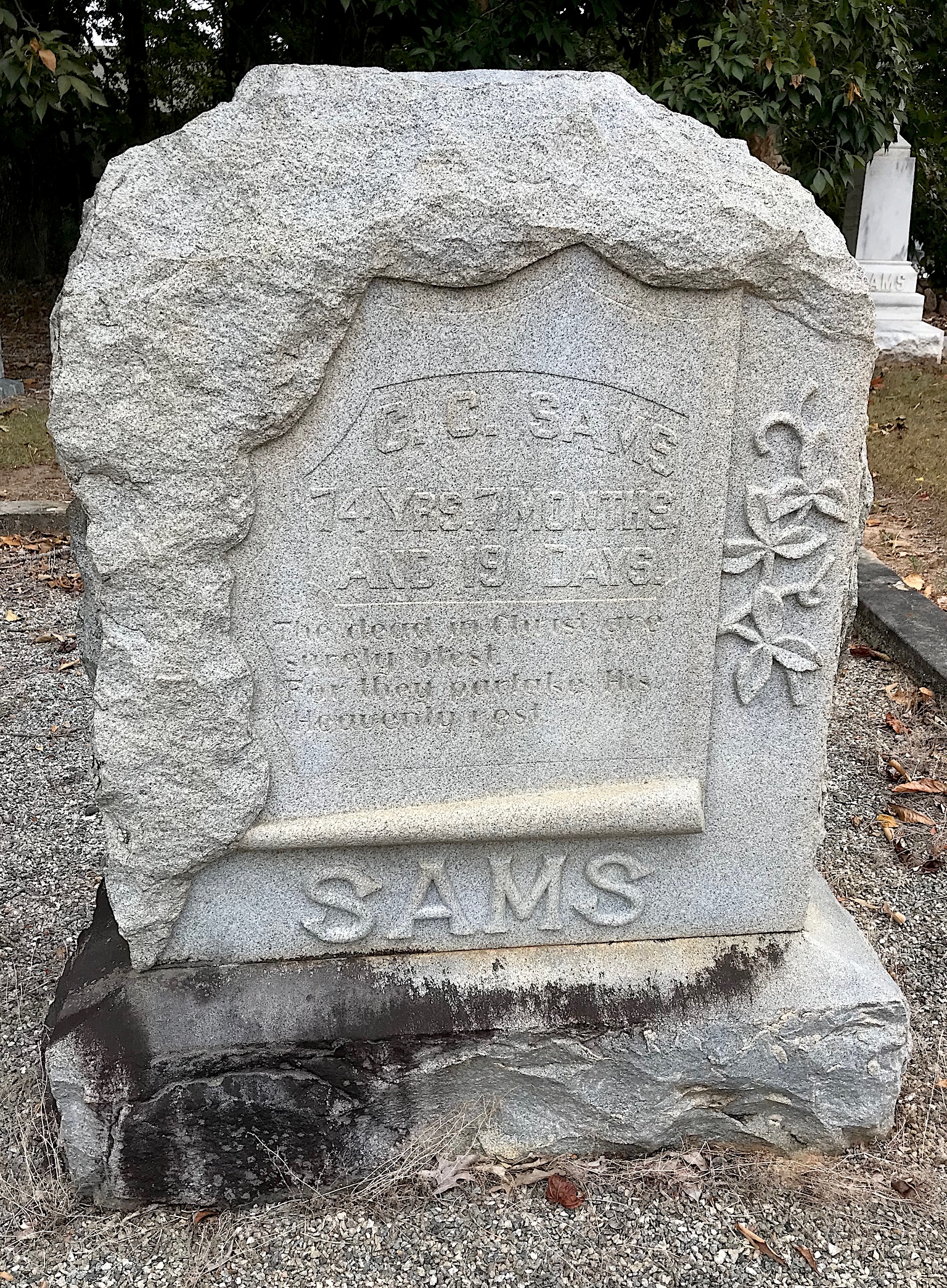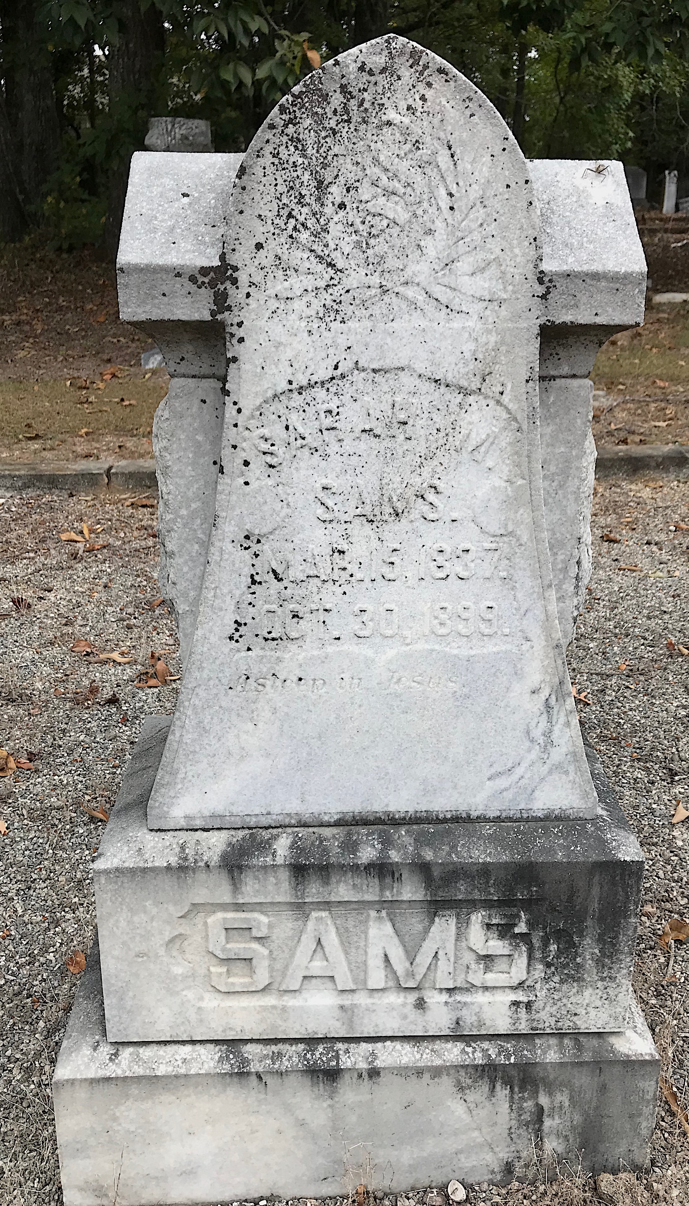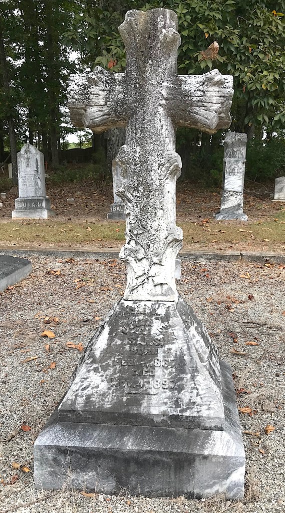 The grave marker for Julia Sams got my attention because it is cross-shaped and has that woodsy Arts and Crafts style that was common during the era. The daughter of Christopher Columbus “Lum” Sams and Sarah Martha Ozborn Sams, Julia was born on Feb. 4, 1867.