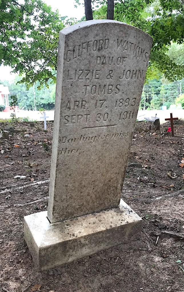 Sadly, I could find very little information about the few people who do have stones here. One example is Clifford Watkins. She was the daughter of Lizzie and John Tombs. She died on Sept. 30, 1911. So she was only 18 when she died. Her grandparents (and possibly her parents) were likely slaves.
