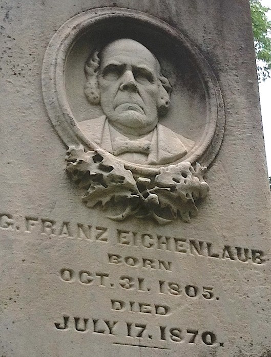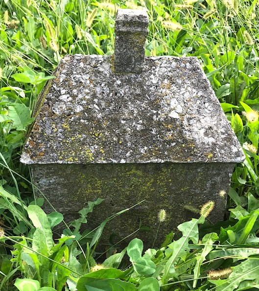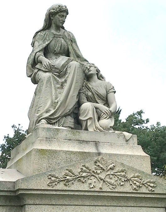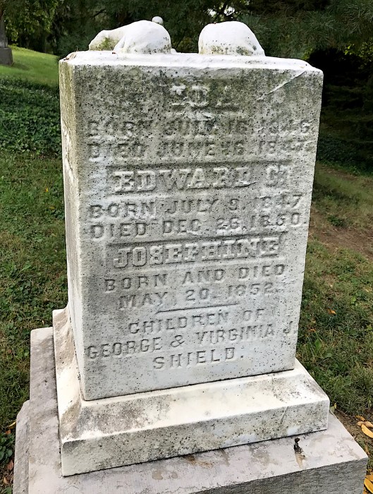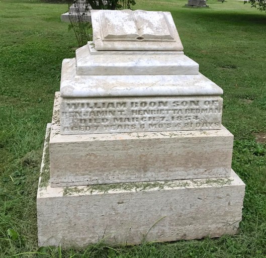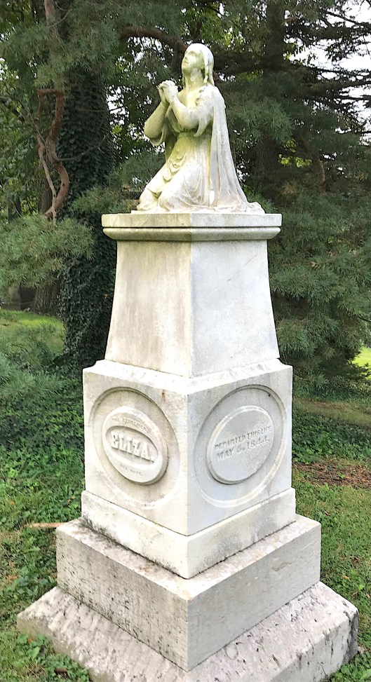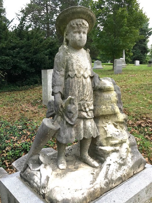According to Woodland’s web site, Johnny’s monument was carved in 1861 by Daniel Ladow, the same fellow who carved the Beckel’s bee hive-topped monument that I wrote about a few weeks ago. A dog guards a sleeping child, dressed in period clothing. Little items like a top, a cap, and a harmonica are incorporated into the monument. On the side are carved the words “In Slumber Sweet”.