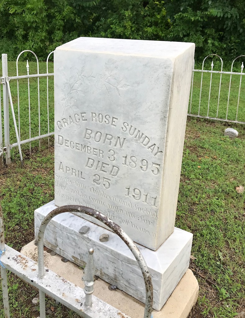 You can’t help noticing the grave site of Grace Sunday because it is the only one surrounded by a handsome iron fence. I was curious about her from the moment I saw it.