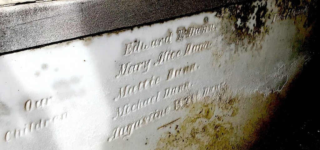 Lizzie gave birth to a son, John, on April 27, 1890. She died less than a month later on May 30, 1890 at age 32. Her death may have been related to the birth, but I don’t know for sure. John (her husband) remarried the following year to Lena Brownlee. They had one son, Claude, together. John died in 1928 at age 75. John, Lizzie, and Lena are all buried at SJC.